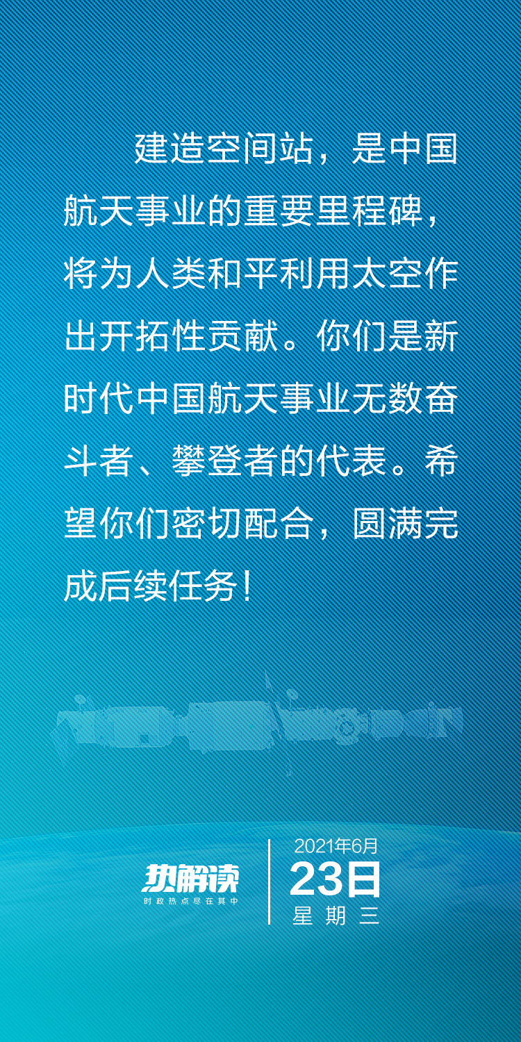在天地通话中,获悉3名航天员的太空生活、工作状态良好,总书记感到欣慰。他高度评价道:“建造空间站,是中国航天事业的重要里程碑,将为人类和平利用太空作出开拓性贡献。”