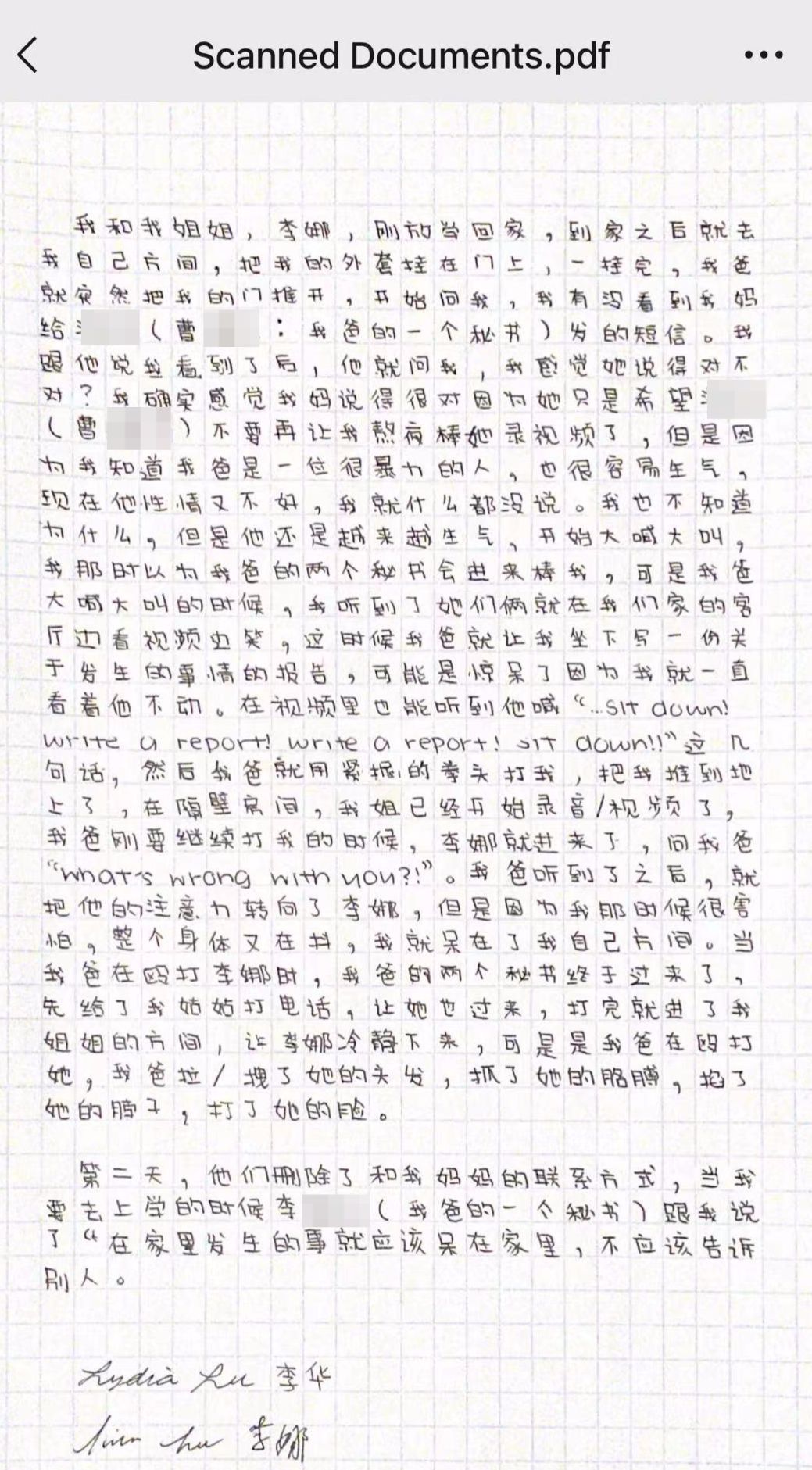 Kim还在社交平台上晒出女儿李华、李娜写的事情经过。并表示女儿想自己来陈述,“李阳实施了暴力行为,他一拳打向一个12岁女孩的脸。而现在他想把自己描述成一个受害者,‘名誉受到了损害’。这个损害是他自己的行为导致的。而他对女儿造成的伤害,他毫不在意。”