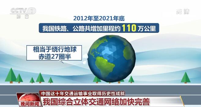 相关负责人介绍,2012年至2021年底,我国铁路、公路共增加里程约110万公里,相当于绕行地球27圈半。高速铁路、高速公路对20万以上人口城市的覆盖率均超过95%。这十年,我国交通基础设施战略支撑能力不断增强。