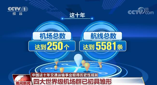 这十年,我国民航运输规模快速增长。机场总数达到250个;航线总数达到5581条;航空服务网络覆盖全国92%的地级行政单元、88%的人口、93%的经济总量。