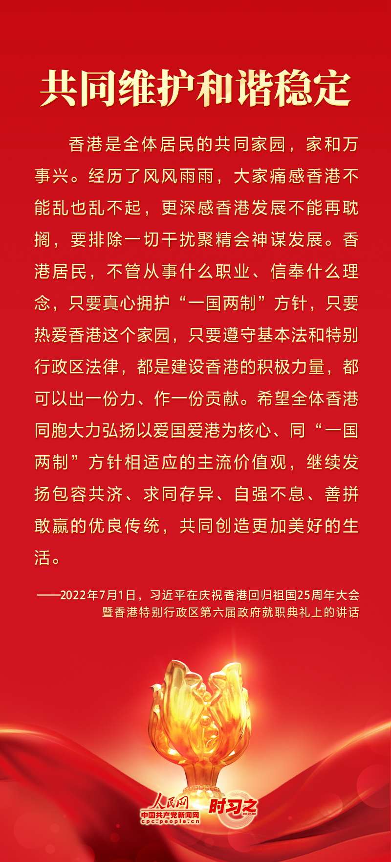 2022年7月1日上午,庆祝香港回归祖国25周年大会暨香港特别行政区第六届政府就职典礼在香港会展中心隆重举行。中共中央总书记、国家主席、中央军委主席习近平出席并发表重要讲话。习近平对香港特别行政区新一届政府和社会各界人士提出4点希望,为香港开创新局面、实现新飞跃指明方向。