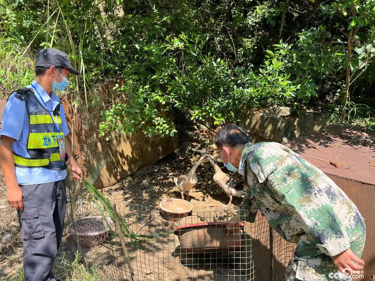 因为鹅对外界声音的敏感性较高,因此边防卡哨常常可见鹅的身影。图为凌赐成(左)和凌天忠(右)在卡点喂鹅。 孙晓媛/摄