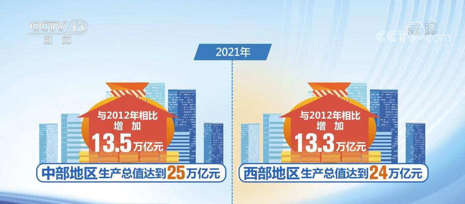 2021年,中部和西部地区生产总值分别达到25万亿元、24万亿元,与2012年相比增加13.5万亿元、13.3万亿元,占全国的比重由2012年的21.3%、19.6%提高到2021年的22%、21.1%。中西部地区经济增速连续多年高于东部地区。东部与中西部人均地区生产总值比分别从2012年的1.69、1.87下降至2021年的1.53、1.68,东西差距持续缩小,区域发展的协调性逐步增强。