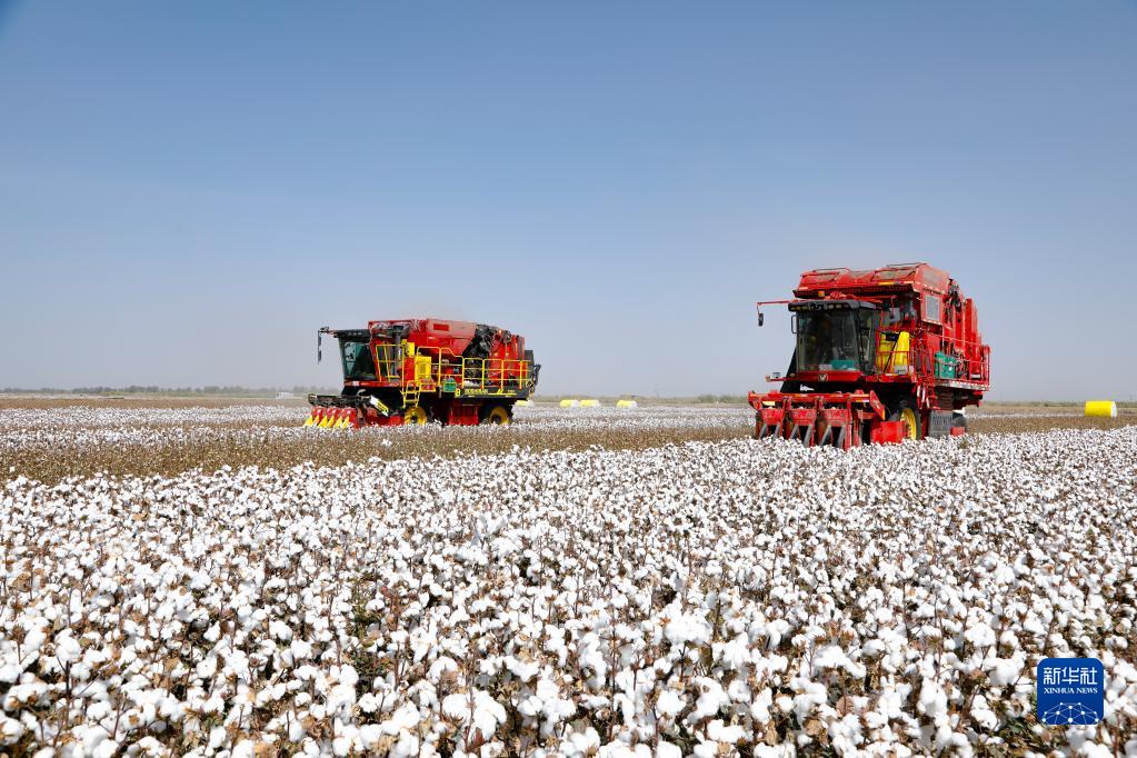 在新疆巴音郭楞蒙古自治州尉犁县兴平镇统其克村,两台国产采棉机在采收棉花(2022年9月30日摄)。新华社发(汪志鹏 摄)