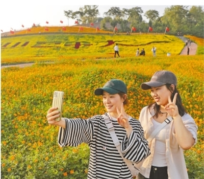 河北省秦皇岛市海港区麻念庄郊野公园日前向公众开放,公园精心布置喜迎二十大主题景观。图为游客正在拍照留念。曹建雄摄(人民视觉)