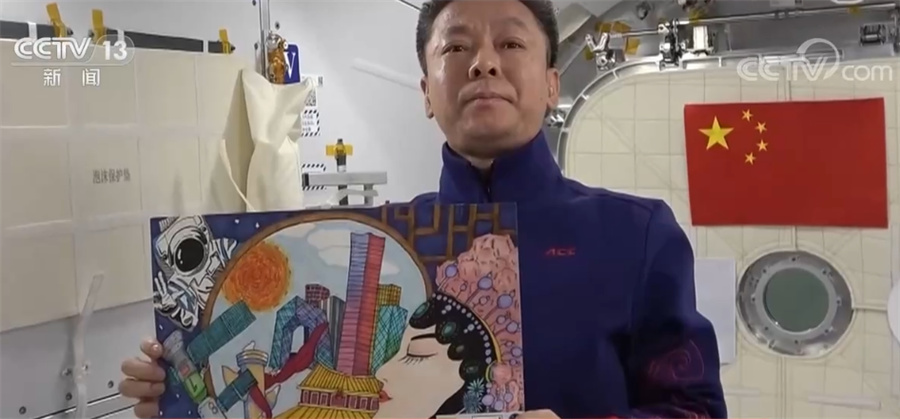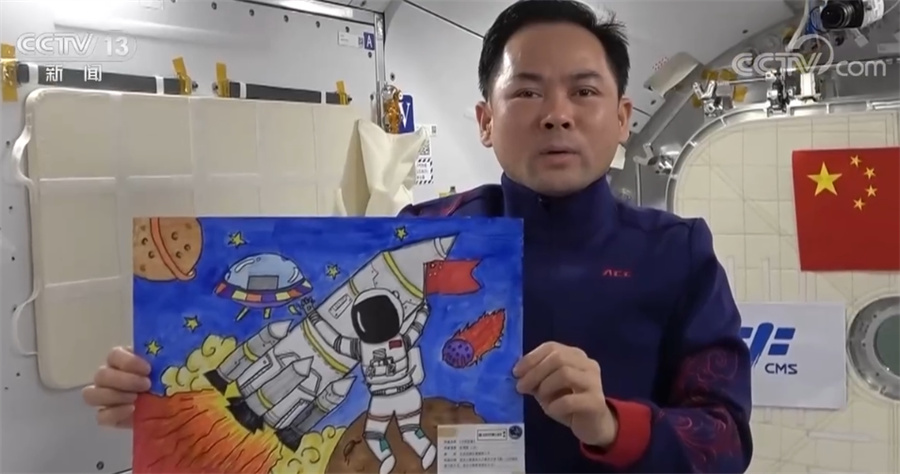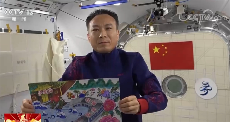 我们赶紧接收一下,大家看:上联是“建强国激流勇进”,由航天员张陆书写;下联是“筑天宫奋楫扬帆”,由航天员邓清明书写;横批:“盛世中华”,由航天员费俊龙书写。