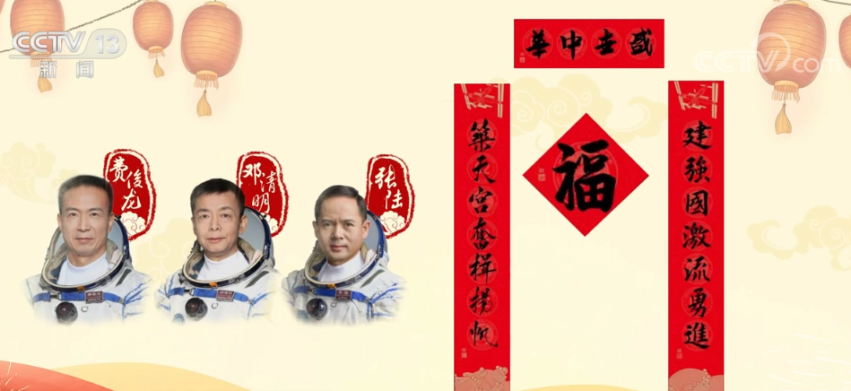 万家团圆之时,神舟十五号乘组航天员费俊龙、邓清明、张陆还送来了太空春联。