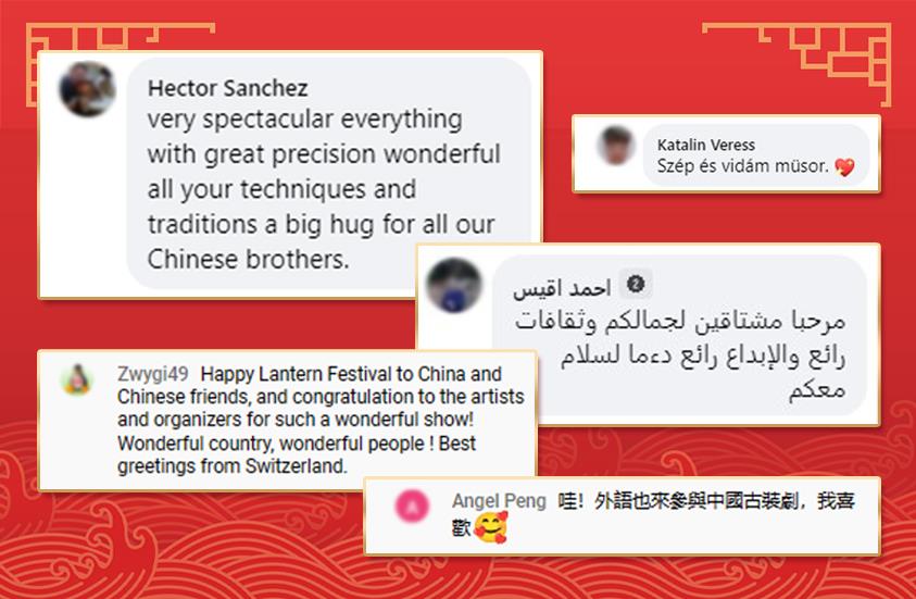 众多海外网友纷纷表达了对元宵晚会的喜爱,特别是对中华优秀传统文化的绝美呈现和中国军人的飒爽英姿赞不绝口。Hector Sanchez留言说:“非常精彩的表演!技法精妙,中国传统拥抱五湖四海的伙伴”,阿拉伯网友留言:“我非常喜欢你们精妙的文化、丰富的想象力”,网友Angel Peng评价《声声慢》说:“哇!外语也来参与中国古装剧,我喜欢”,瑞士网友Zwygi49点赞晚会:“祝中国和中国朋友元宵节快乐,祝贺艺术家和组织者举办如此精彩的演出! 美好的国度,美好的人民”。