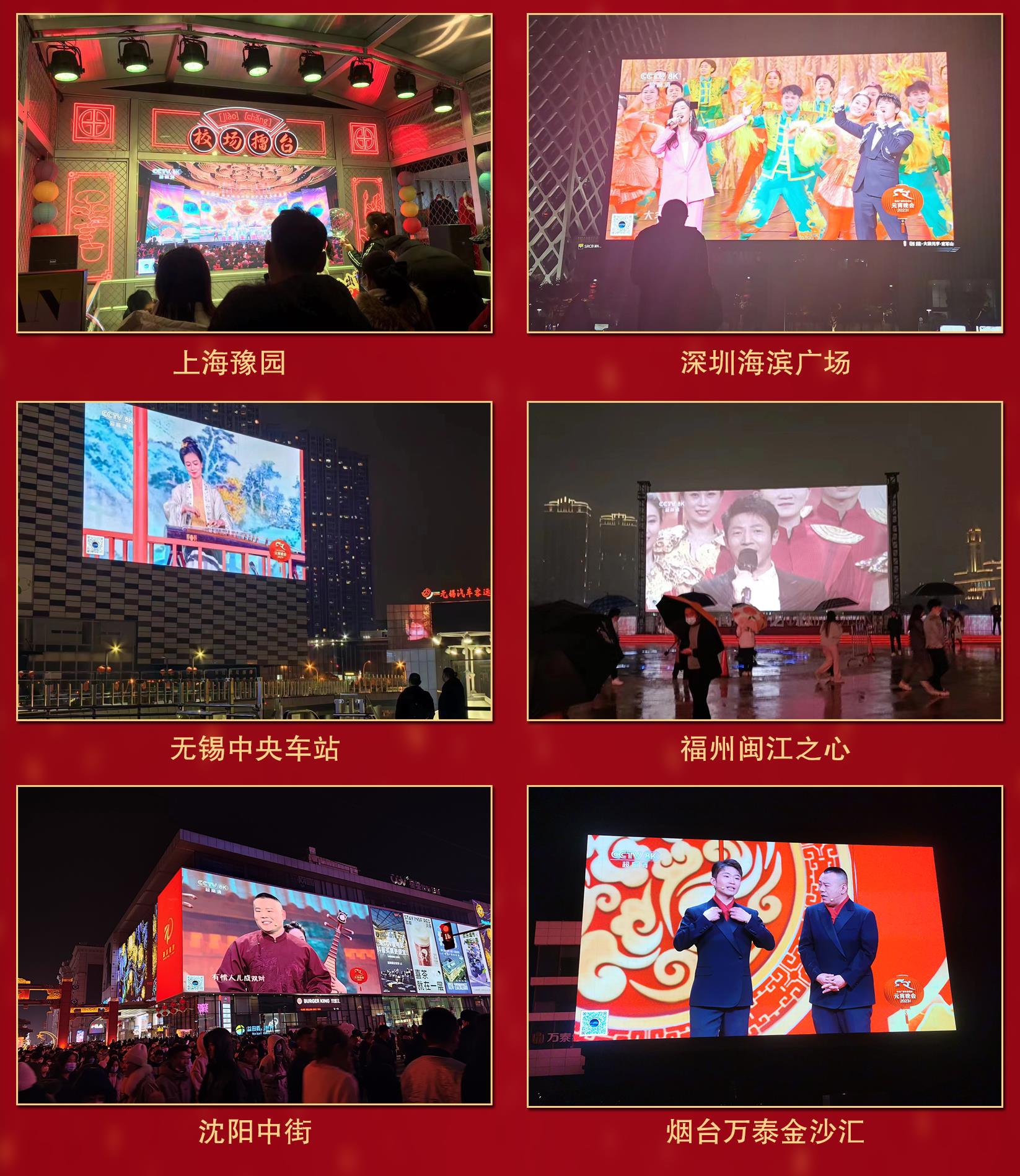 “百城千屏”新体验。总台“百城千屏+云听”双平台在上海豫园、深圳海滨广场、无锡中央车站、福州闽江之心、沈阳中街等全国70多个城市的500多块户外大屏同步直播总台元宵晚会。“在广场看晚会闹元宵”成为城市文化活动新场景。