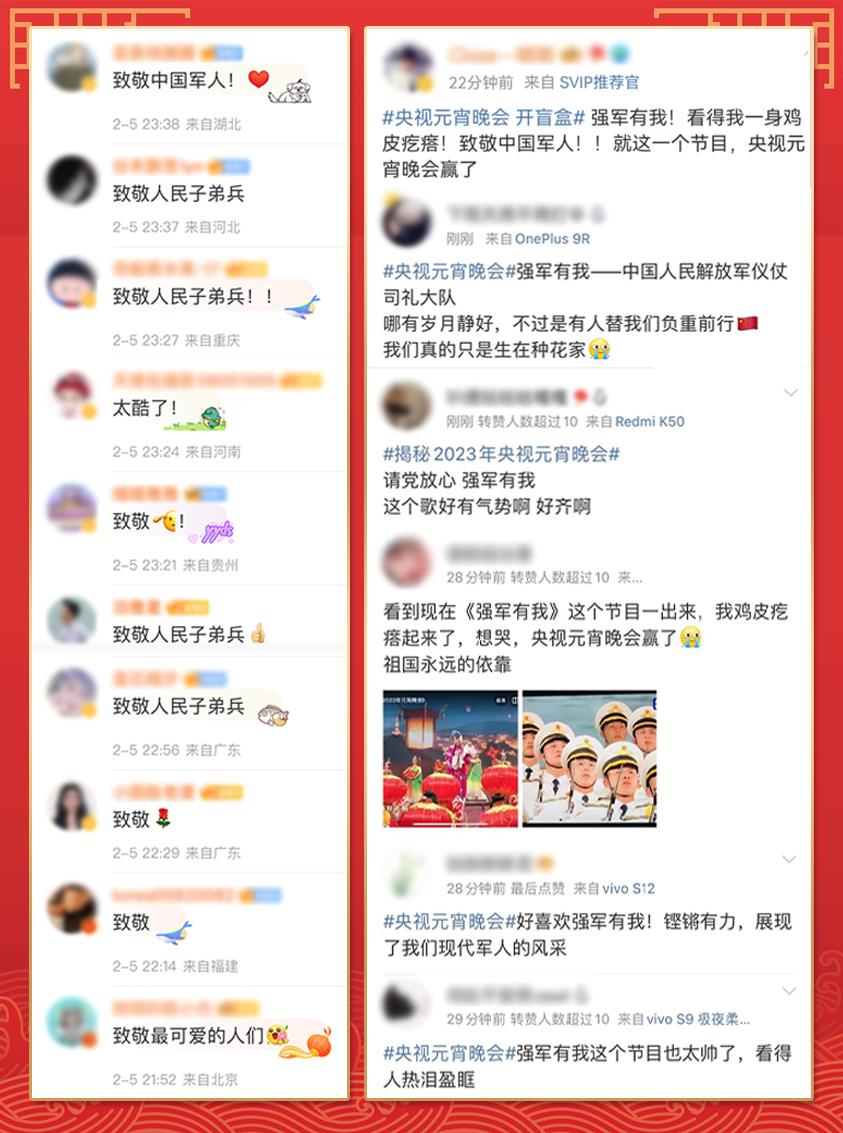 “请党放心,强军有我”“清澈的爱,献给我的祖国”……声声誓言、字字铿锵。首次参加总台元宵晚会的中国人民解放军仪仗司礼大队奏唱的歌曲《强军有我》,不仅唱出中国军人的拳拳赤子心,更唱出了“最可爱的人”那豪迈激情和磅礴气势。整齐划一的动作、坚定有力的眼神让无数网友直呼:“震撼!这就是中国排面”“为人民子弟兵热泪盈眶”“致敬中国军人!感谢你们为大家负重前行”。而网友们也用整齐一致的留言共同致敬“最可爱的人”。