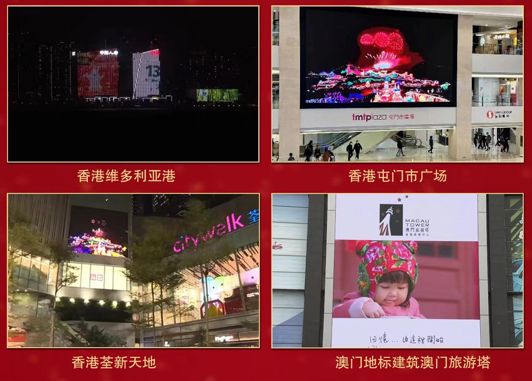 港澳同欢一家亲。在香港维多利亚港、澳门旅游塔等标志性旅游胜地和香港奥海城、屯门市广场、荃新天地等热门商圈的87块大屏上播放元宵晚会宣传片,并首次实现在香港3300辆公共巴士的电视屏幕循环播放,节日欢歌伴随着香港市民日常出行。