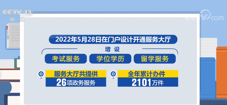 不仅有丰富优质的教育教学资源,平台还聚焦重点领域推出优质高效的公共服务。2022年3月28日,国家大学生就业服务平台作为国家门户首个公共服务上线,提供了丰富的政策、岗位信息和指导服务,全年共享岗位达到1370万个,通过平台就业的毕业生占比从2021年的24%增长到2022年的31.6%。2022年5月28日,在门户设计开通服务大厅,增设考试服务、学位学历、留学服务三个栏目,服务大厅共提供26项政务服务,全年累计办件2101万件。