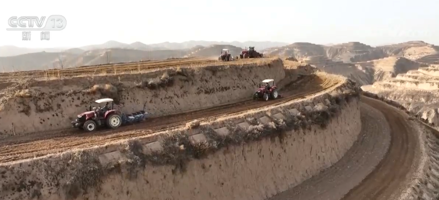总台记者 贺威通:我现在是在山西临汾永和县的十万亩梯田,我身后的这些拖拉机带着旋耕机正在进行春耕作业,一方面防止土壤板结,保持土壤疏松度;另外一方面,这些粉碎后的秸秆也会还田,增加土壤的有机质,起到保水保墒的作用。
