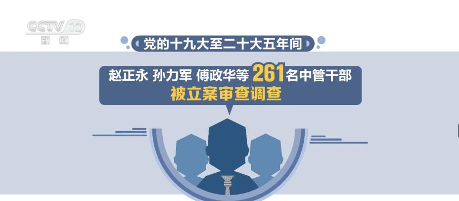 根据通报,党的十九大至二十大五年间,赵正永、孙力军、傅政华等261名中管干部被立案审查调查。全国纪检监察机关共立案306.6万件,处分299.2万人;立案审查调查行贿人员4.8万人,移送检察机关1.3万人。