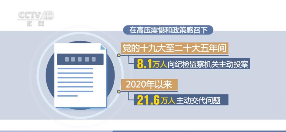 在高压震慑和政策感召下,党的十九大至二十大五年间,8.1万人向纪检监察机关主动投案,2020年以来,21.6万人主动交代问题。