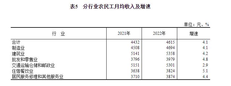 分行业看,六大行业收入均保持增长。从事制造业农民工月均收入4694元,比上年增加186元,增长4.1%;从事建筑业农民工月均收入5358元,比上年增加217元,增长4.2%;从事批发和零售业农民工月均收入3979元,比上年增加183元,增长4.8%;从事交通运输仓储和邮政业农民工月均收入5301元,比上年增加150元,增长2.9%;从事住宿餐饮业农民工月均收入3824元,比上年增加186元,增长5.1%;从事居民服务修理和其他服务业农民工月均收入3874元,比上年增加164元,增长4.4%。