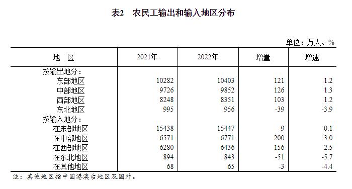 从输入地看,流向中部和西部地区的农民工人数增长较快,流向东北地区的农民工减少。其中,在东部地区就业的农民工15447万人,比上年增加9万人,增长0.1%;在中部地区6771万人,比上年增加200万人,增长3.0%;在西部地区6436万人,比上年增加156万人,增长2.5%;在东北地区843万人,比上年减少51万人,下降5.7%。