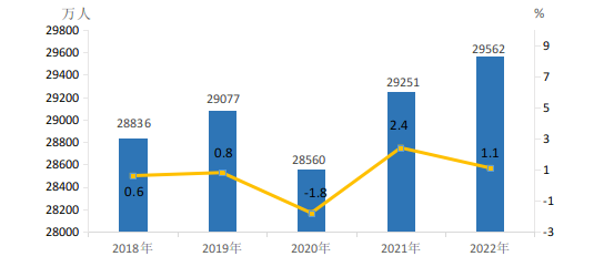 2022年全国农民工总量29562万人,比上年增加311万人,增长1.1%。其中,本地农民工12372万人,比上年增加293万人,增长2.4%;外出农民工17190万人,比上年增加18万人,增长0.1%。年末在城镇居住的进城农民工13256万人。