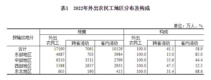 在外出农民工中,跨省流动7061万人,比上年减少69万人,下降1.0%;省内流动10129万人,比上年增加87万人,增长0.9%。从输出地看,中部地区跨省流动农民工占外出农民工的比重为55.6%,西部地区为47.5%,东北地区为31.4%,东部地区为15.0%。