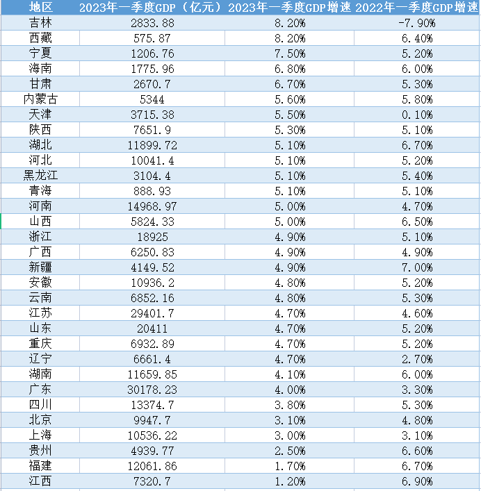 第一财经梳理对比,一季度GDP增速低于全国水平的8个省份有湖南、广东、四川、北京、上海、贵州、福建和江西。其中,江西、福建、贵州、湖南和四川去年一季度GDP分别增长6.9%、6.7%、6.6%、6.0%和5.3%,增速分别位居全国第二、三、四、七和十位。