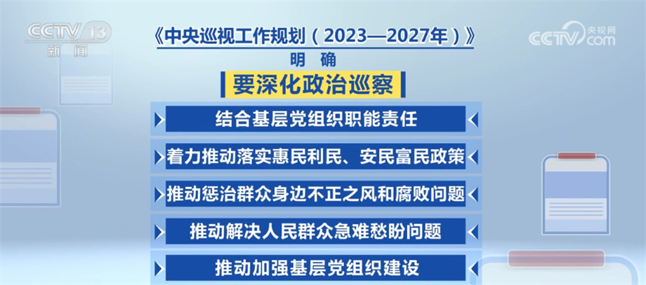 央视网消息:近日,经党中央同意,中共中央办公厅印发了《中央巡视工作规划(2023—2027年)》,对今后5年的巡视工作作出了部署。一届任期内实现巡视全覆盖,是党章规定的政治任务。通过什么样的方式实现二十届中央巡视全覆盖?采取哪些措施高质量推进巡视全覆盖?在此次印发的巡视工作规划中都作出了要求。