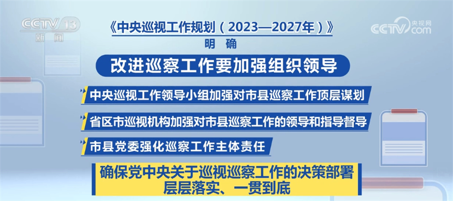 《中央巡视工作规划(2023—2027年)》明确,改进巡察工作要加强组织领导。中央巡视工作领导小组加强对市县巡察工作顶层谋划,省区市巡视机构加强对市县巡察工作的领导和指导督导,市县党委强化巡察工作主体责任,确保党中央关于巡视巡察工作的决策部署层层落实、一贯到底。