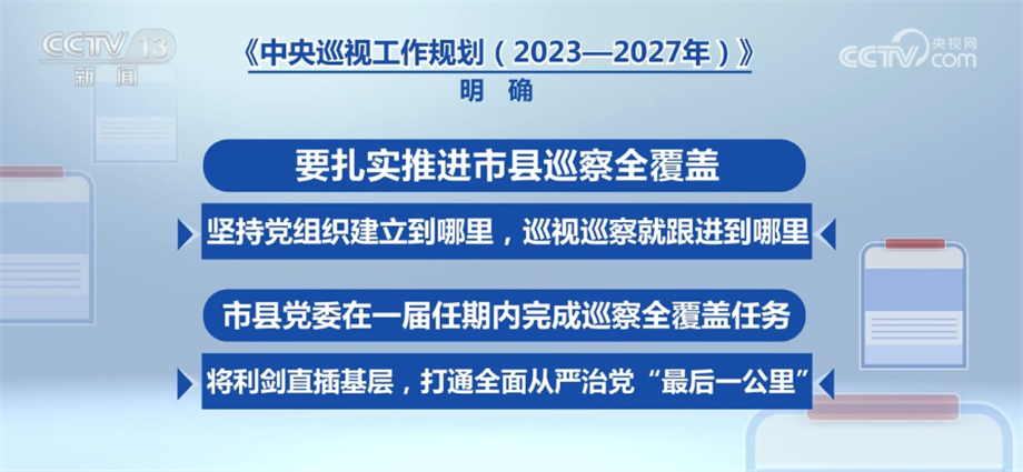 加强市县巡察是推动全面从严治党向下延伸的有力抓手。巡察工作怎样深化发展?如何发挥好巡察综合监督作用,确保惠民政策落地?《规划》从多个方面作出了部署。