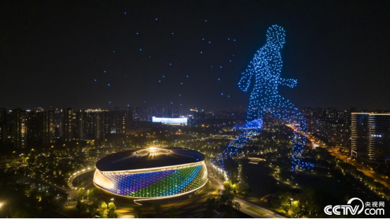 2023年5月13日,杭州亚运会乒乓球比赛场地——拱墅运河体育公园体育馆上空上演无人机灯光秀表演。