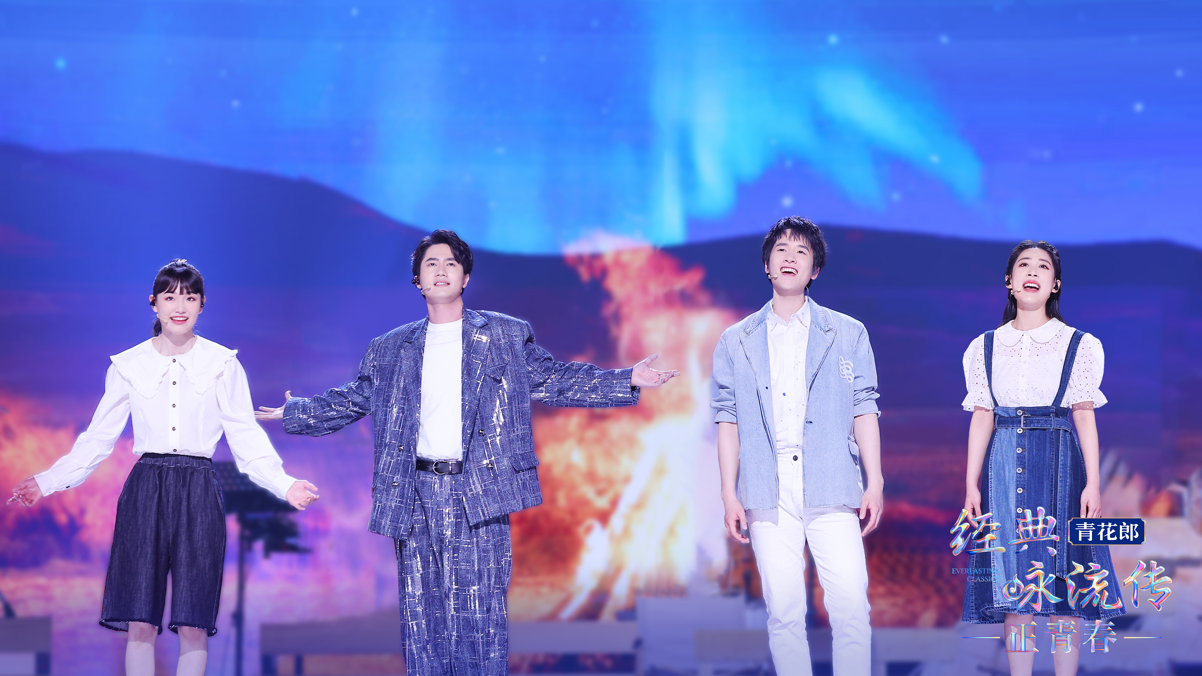 马代表着纵横驰骋、不断向前的精神,是中国古典诗词十分重要的素材。“诗鬼”李贺一生爱马,常以马自喻,通过描写不同模样、不同境况的马,向众人倾诉自己的抱负,《马诗二十三首》便是他在青春时期的精华之作。北京师范大学副校长康震说:“李贺其实就是想借着这二十三首诗和二十三匹马,来写自己的人生,写自己人生的期待。”也因此,大家在马的身上,会看到这位青年才俊的青春岁月、青春状态甚至青春思想。四位青年音乐剧演员赖仙宇、周默涵、刘宇希、陈恬将《马诗二十三首》中的部分作品融合成一首歌曲,用男女声四重唱的形式唱出李贺心中奔涌的热血。为体现马的自由洒脱和轻盈跃动,经典传唱人们不仅特意设计了打响指、跺脚等动作,还在舞台中巧妙融入各种乐器,将马的各种神态演绎得栩栩如生,呈现出一幅生机勃勃的“奔马图”。