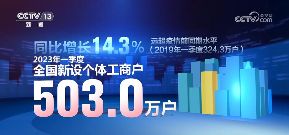央视网消息:市场监管总局5月22日发布最新数据显示,2023年一季度,全国新设个体工商户503.0万户,同比增长14.3%,远超疫情前同期水平。