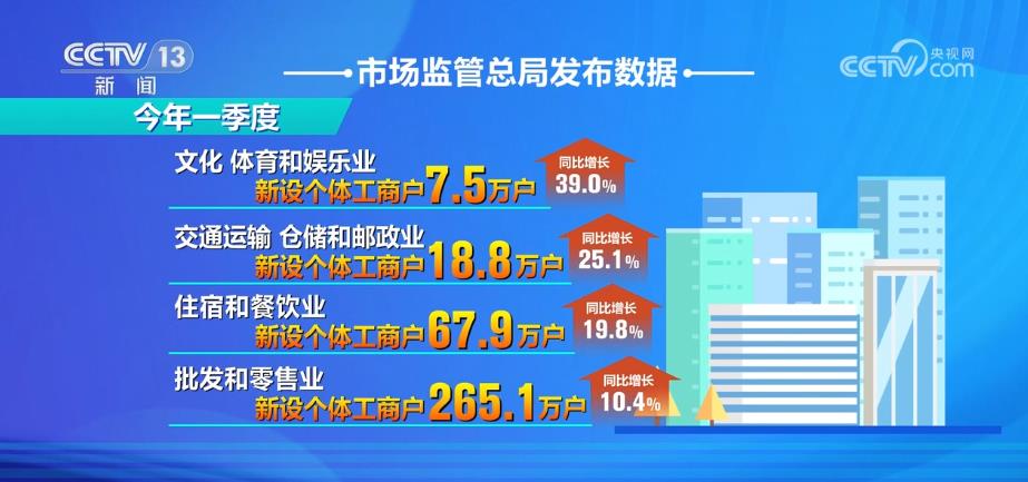 市场监管总局发布数据显示,今年一季度,文化、体育和娱乐业,交通运输、仓储和邮政业,住宿和餐饮业,批发和零售业等行业新设个体工商户分别为7.5万户、18.8万户、67.9万户、265.1万户,同比分别增长39.0%、25.1%、19.8%、10.4%。