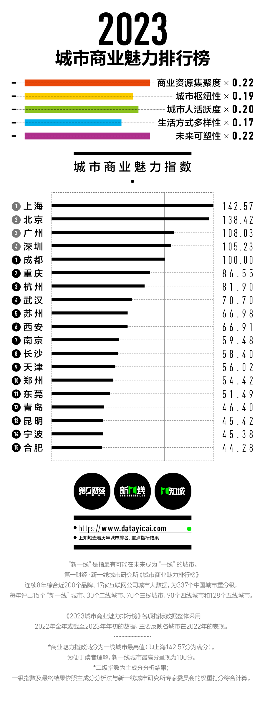 《城市商业魅力排行榜》的指标体系包含了商业资源集聚度、城市枢纽性、城市人活跃度、生活方式多样性和未来可塑性五大一级维度。榜单的一级与二级维度权重以新一线城市研究所专家委员会打分的方式计入,二级维度以下指标数据则采用主成分分析法。