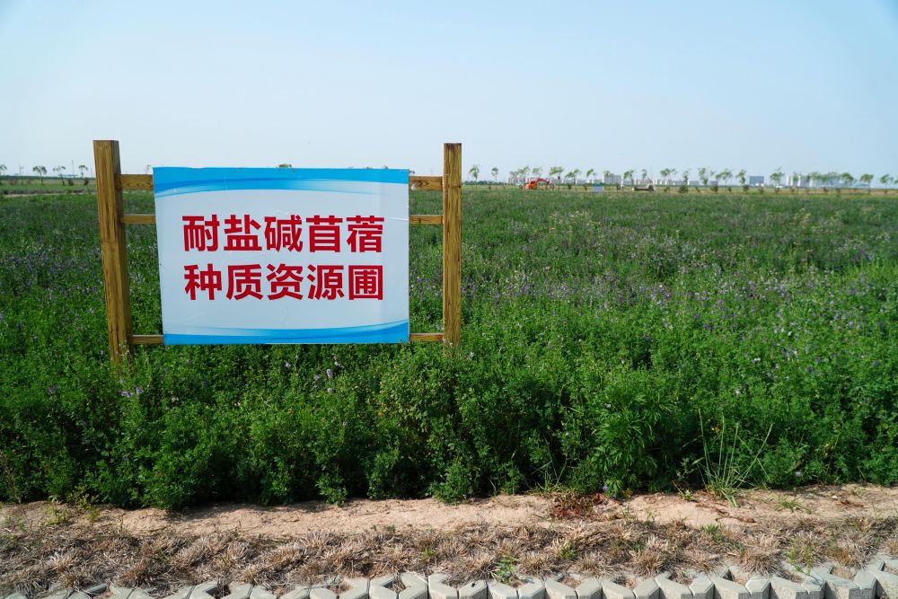 5月19日,位于山东省东营市黄河三角洲农业高新技术产业示范区的耐盐碱苜蓿种质资源圃。新华社记者 徐速绘 摄
