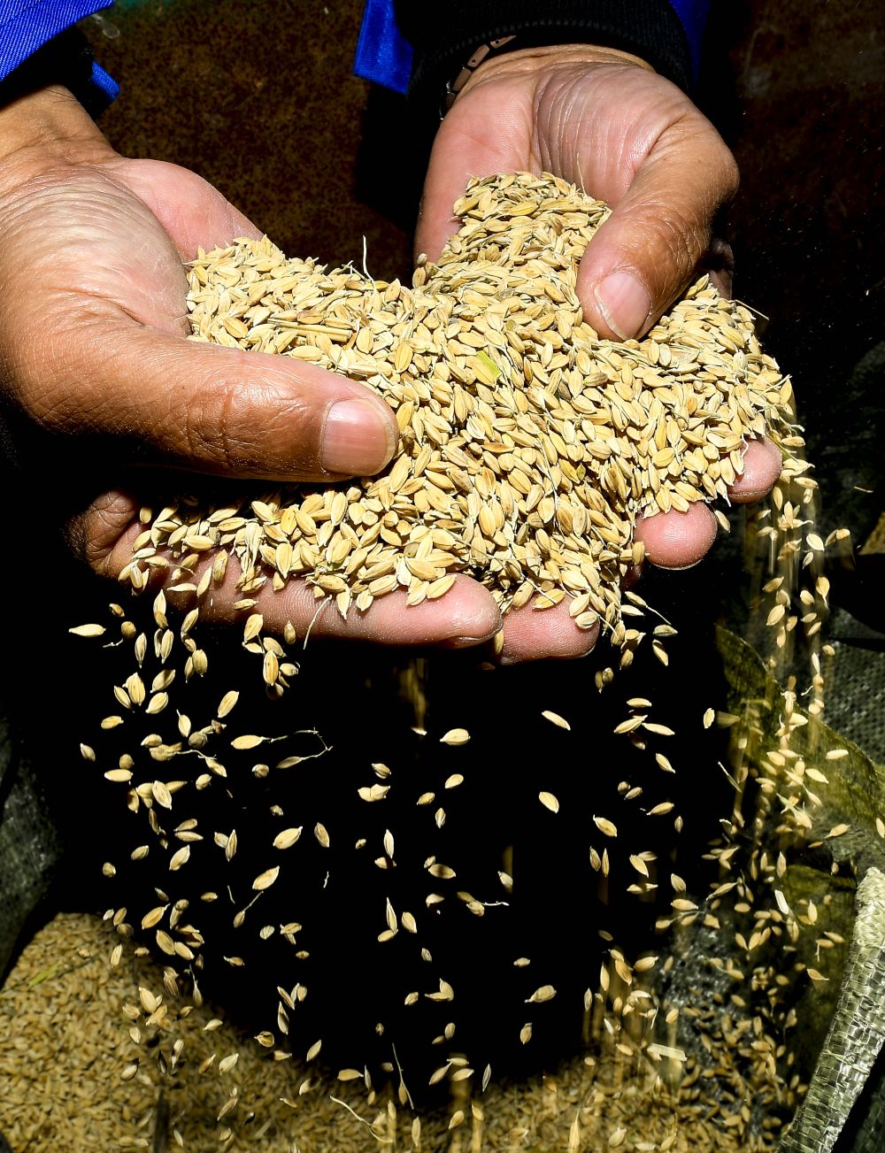 在吉林省大安市海坨乡盐碱地生态修复治理示范基地,农民查看收获的稻谷(2022年10月12日摄)。新华社记者 许畅 摄