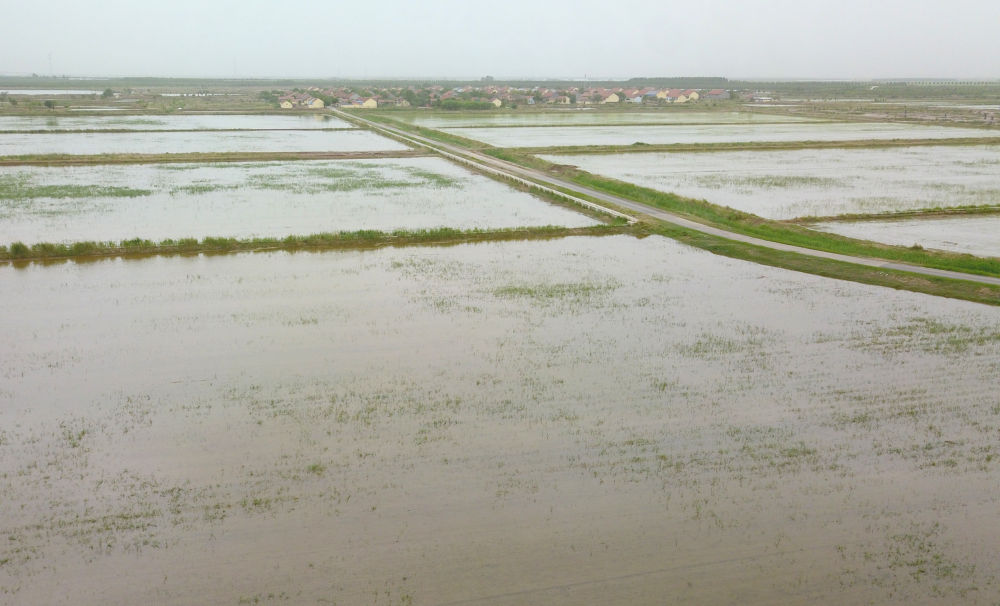 5月20日,山东省东营市垦利区黄河口镇,盐碱地改良的田地上已播种海水稻秧苗(无人机照片)。新华社记者 徐速绘 摄