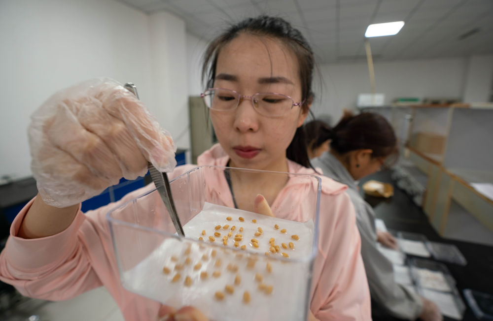 5月25日,在河北沧州渤海新区黄骅市中捷产业园区农科所种子检验室,技术人员在做小麦出芽率实验。新华社记者 骆学峰 摄