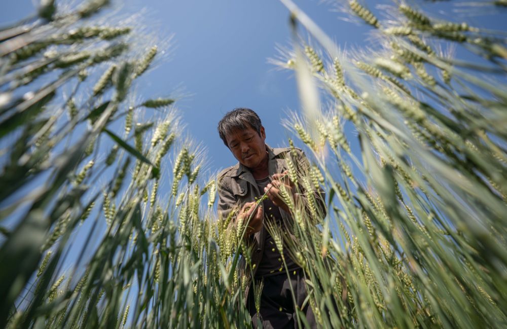 5月19日,在山东省东营市黄河三角洲农业高新技术产业示范区,农科人员在观察“济麦60”的生长情况。新华社记者 徐速绘 摄