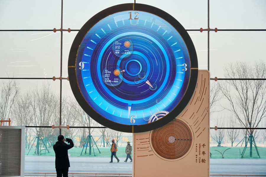 旅客在京雄城际铁路雄安站内拍摄“千年轮”(2020年12月27日摄)。新华社记者 牟宇 摄