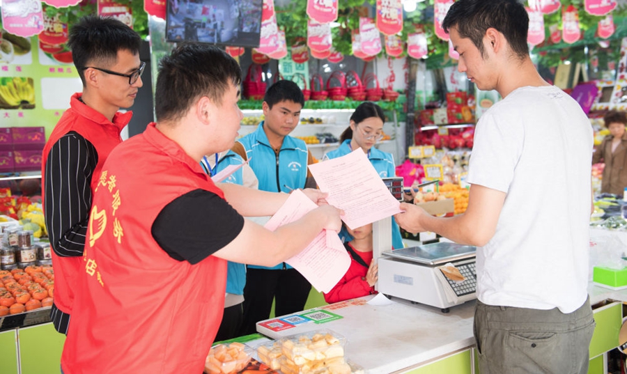 浙江省湖州市吴兴区八里店镇结合主题教育和“三服务”,推进“民生大走访”工作机制,全体网格员下沉村、社一线,了解社情民意,化解矛盾纠纷,服务村社群众。这是八里店镇中心片区网格员(蓝衣者)和志愿者(红衣者)对一家店铺进行平安问卷调查(2019年10月31日摄)。新华社记者 翁忻旸 摄