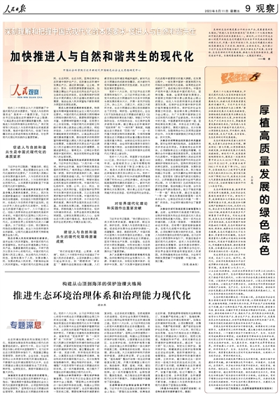 良好的生态环境是最公平的公共产品,是最普惠的民生福祉。“促进人与自然和谐共生”是党的二十大报告概括的中国式现代化的本质要求之一。新时代,以习近平同志为核心的党中央把生态文明建设作为关系中华民族永续发展的根本大计,开展一系列开创性工作,生态文明建设从理论到实践都发生了历史性、转折性、全局性变化。我们要以习近平生态文明思想为指引,坚定不移走生产发展、生活富裕、生态良好的文明发展道路,推进人与自然和谐共生,建设美丽中国。本期观察版围绕这一主题进行阐述。