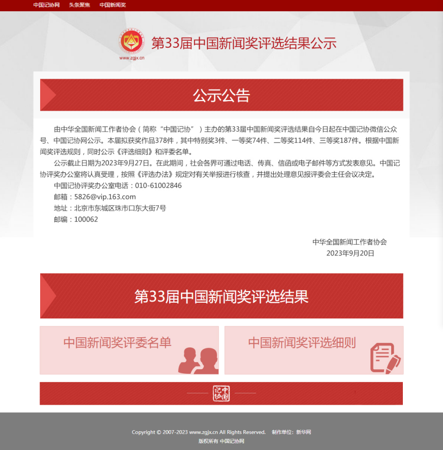 自9月20日起,中国记协在中国记协微信公众号、中国记协网公示第33届中国新闻奖评选结果。本届中国新闻奖共评选出378件拟获奖作品,其中特别奖3件、一等奖74件、二等奖114件、三等奖187件。同时公示的还有本届《中国新闻奖评选细则》和评委名单。