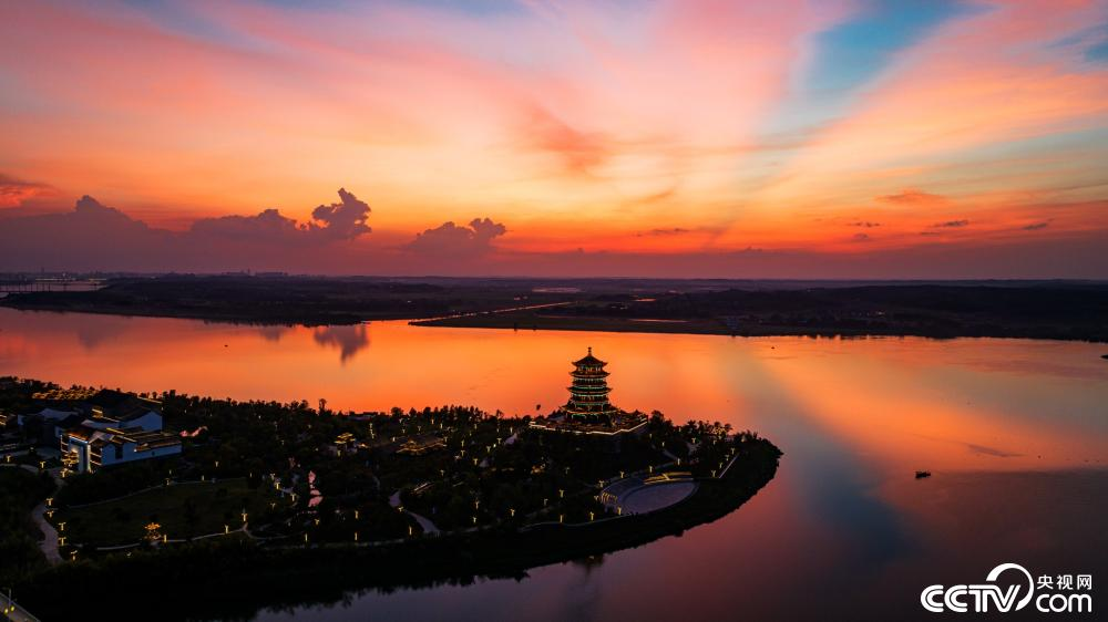 江西吉安,夕阳西下,漫天霞光映红江面。