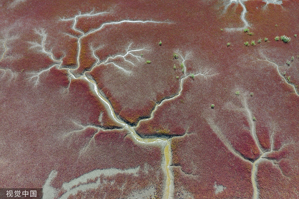 辽宁盘锦,大洼区红海滩的潮沟与碱蓬草编织成一幅迷人图案。