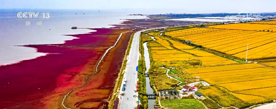 在辽宁盘锦,红海滩景区的碱蓬红草进入秋初后生长旺盛期,进入最佳观赏季。用颜值引来不少游客,畅游其中,宛如置身大自然的调色盘中。