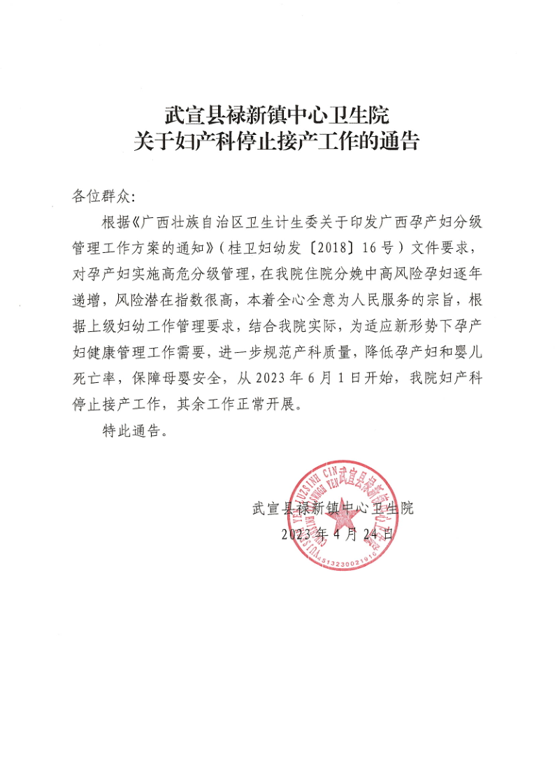 该院通告称,根据《广西壮族自治区卫生计生委关于印发广西孕产妇分级管理工作方案的通知》(桂卫妇幼发 [2018] 16 号)文件要求,对孕产妇实施高危分级管理,在我院住院分娩中高风险孕妇逐年递增,风险潜在指数很高,本着全心全意为人民服务的宗旨,根据上级妇幼工作管理要求,结合我院实际,为适应新形势下孕产妇健康管理工作需要,进一步规范产科质量,降低孕产妇和婴儿死亡率,保障母婴安全,从2023 年6月1日开始,我院妇产科停止接产工作,其余工作正常开展。