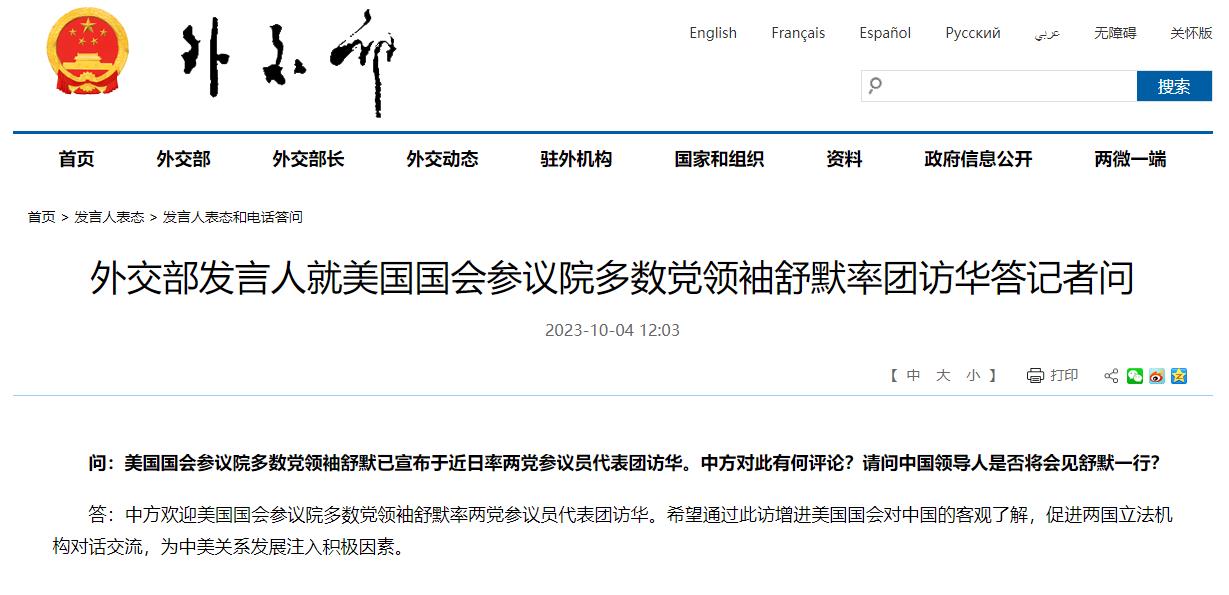 答:中方欢迎美国国会参议院多数党领袖舒默率两党参议员代表团访华。希望通过此访增进美国国会对中国的客观了解,促进两国立法机构对话交流,为中美关系发展注入积极因素。