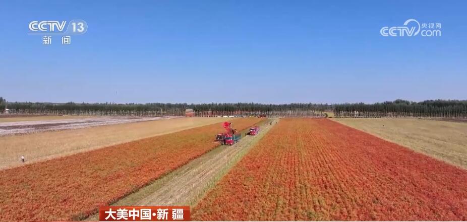 现在我们看到的是新疆沙湾市安集海镇的辣椒种植地。眼下,正是辣椒采收旺期,一串串色泽鲜亮的辣椒挂满枝头,采收机在田间穿梭作业。