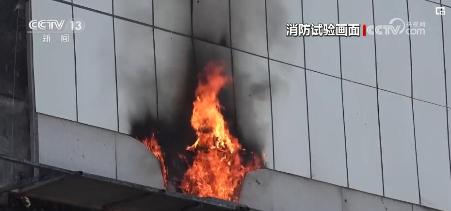 试验开始。试验人员将一处明火火源放置在铝塑板外立面的底部。相比不太易燃的铝塑板,下层的保温层,也就是聚氨酯泡沫几秒钟时间就被引燃,并且逐步向四周蔓延。一分钟后,最底部的铝塑板在烈焰炙烤下,表层的铝箔开始卷曲飘落,铝塑板也很快被点燃,随后迅速变形脱落。随着更多的保温层被点燃,聚氨酯泡沫燃烧熔融形成滴落火,也在下方形成多处明火。点火3分钟后,火势明显变大,出现大量黑色的有毒浓烟。5分钟后,火焰已经蹿上距离点火点大概10米的位置,现场浓烟滚滚。此时,这款双旋翼消防灭火无人机搭载系留水管迅速升空,将高压液体从无人机前端喷枪喷出,快速覆盖起火位置。用时不到1分钟,此前超过三层楼高的明火就被全部扑灭。