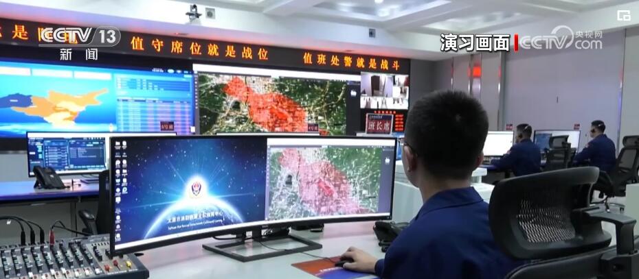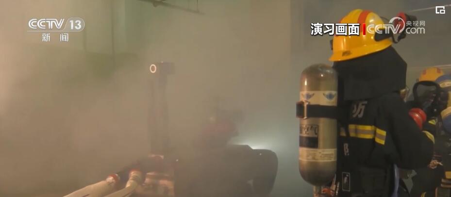 演习过程中,举高喷射消防车从外部进行灭火作业的同时,多支消防救援小队进入商场内部,在浓烟中实战模拟火场搜救和灭火作战。在救援人员的遥控指挥下,消防救援机器狗首先突入火场,利用身上加装的烟气成分分析仪、摄像头等多种设备,实时监测环境危险状况,并对火场环境进行侦察。在大火猛烈燃烧、建筑物结构不稳定情况下,消防救援人员远程控制无人灭火机器人首先进入火场,进行前期灭火作业。为保障内攻救援人员安全,消防员综合定位系统也投入使用。每名消防员都携带平板终端和定位信标,指挥员可以实时掌握进入火场人员的生命体征、实时位置。一旦救援人员遇险,系统能够第一时间引导紧急救援小组展开营救行动。