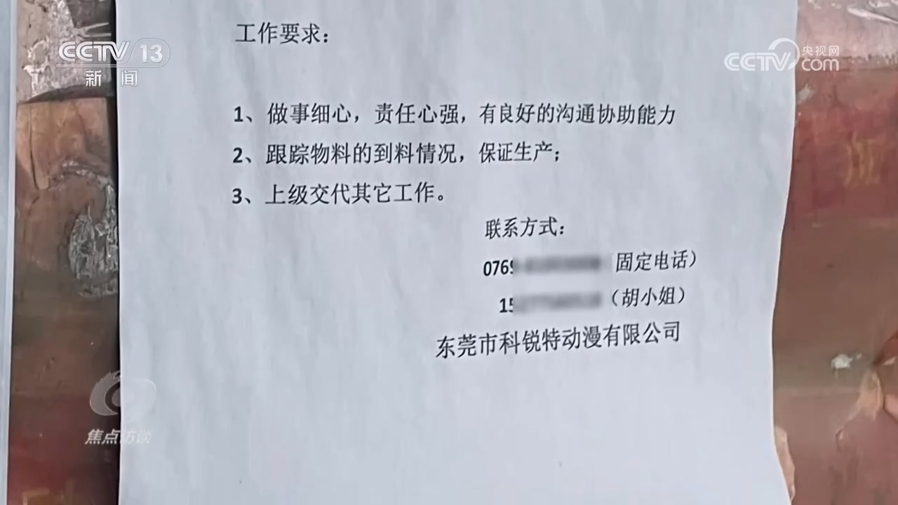 随后,记者在佳辉公司的门口看到了几张招工启示,其中一张的招工单位落款正是科锐特公司,看来,两家公司必定有所关联。于是,记者想办法再次进入到了“佳辉”的生产车间,发现工人们正在生产所谓的“美少女”手办的组合部件。